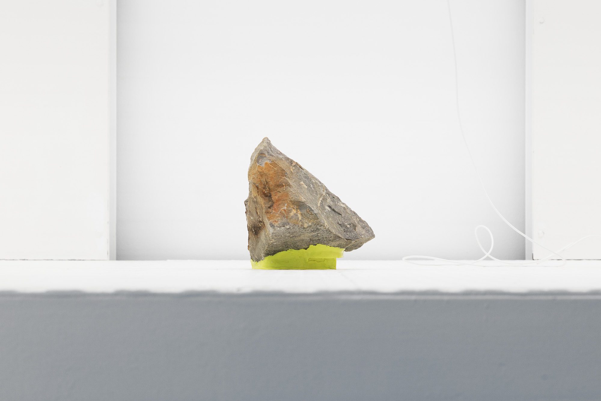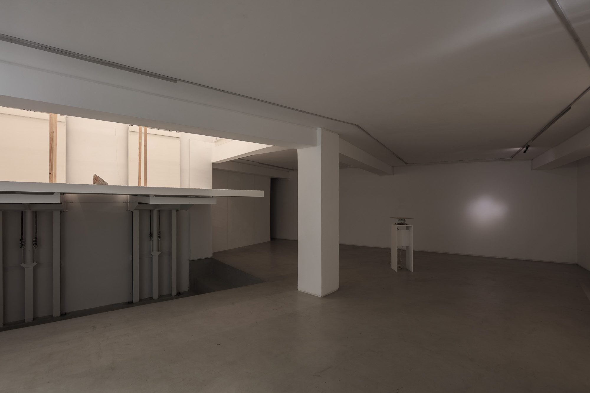 This line of thought is disrupted by Demystifying a Stone, suspended within the elevator shaft. A metal structure connects fragments of a stone cast arranged as a geometric “exploded view,” as if following an impact or an internal rupture. The energy released by this symbolic explosion appears to condense into a vortex of water trapped inside a flask, delicately balanced above. Below, almost concealed, the original stone rests near the ground, returned to its material origin and stripped of mystification, while the movement it generates unfolds vertically through the gallery space.