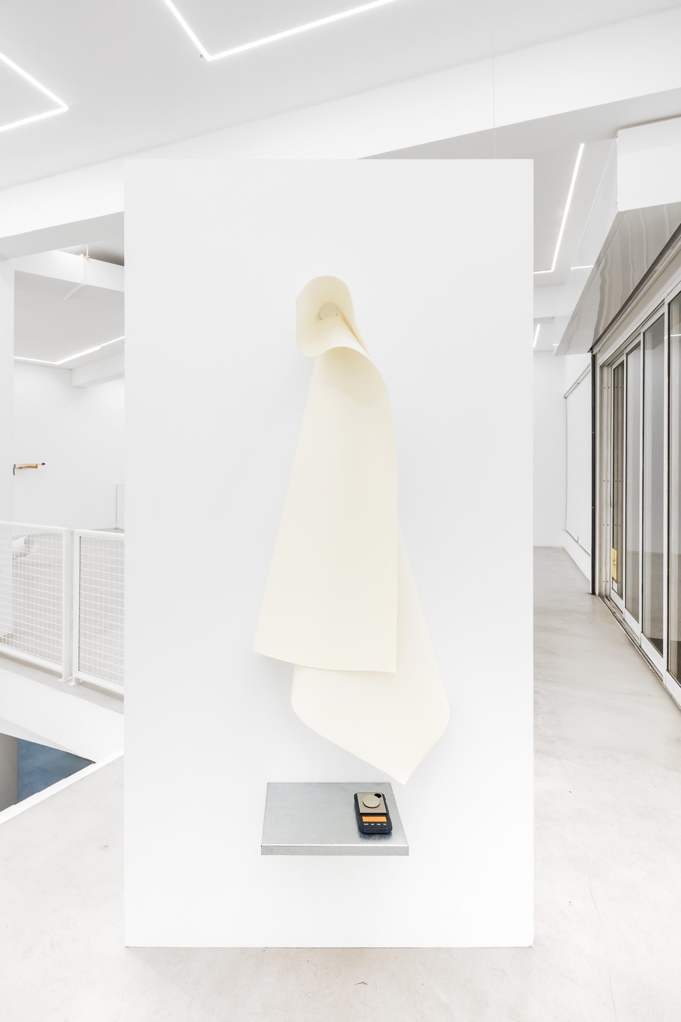 Before descending to the lower floor, More Pressure More Release offers an intimate pause. A length of fabric slowly rolls and unrolls, driven by a motor that alternates effort and surrender. The motion is cyclical, gentle, and fragile, giving the fabric a sculptural presence without ever allowing it to settle. At each cycle, its end brushes against the plate of a precision scale designed to measure a weight that cannot be named.