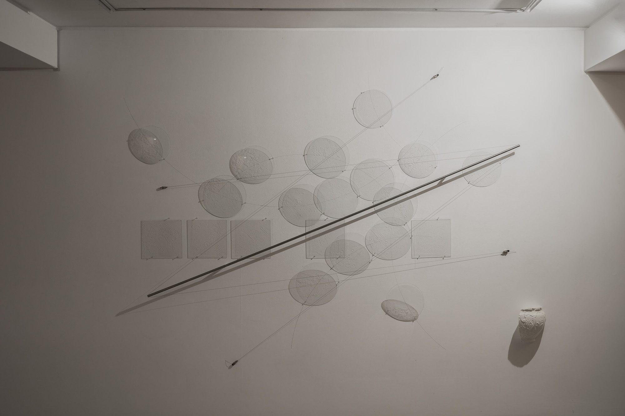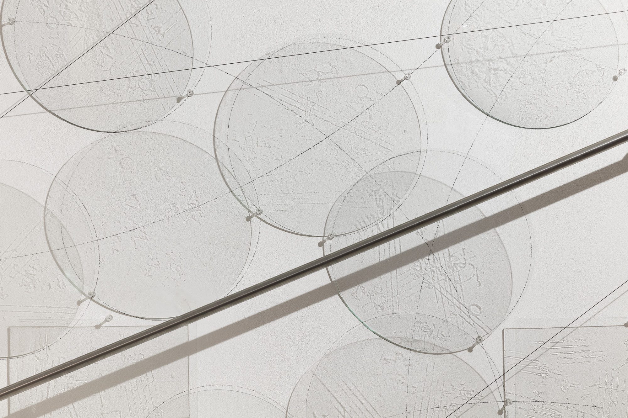 Glass, Steel rod and cables, Transparent glossy varnish, Plaster, Light
