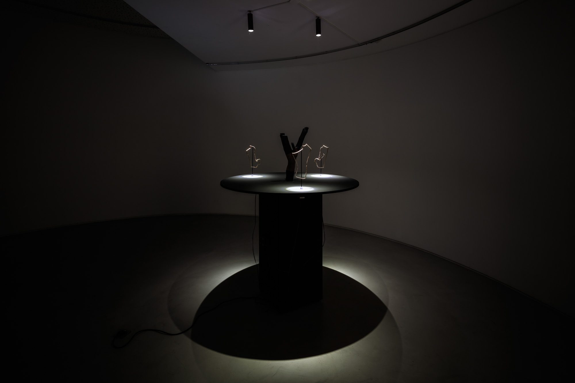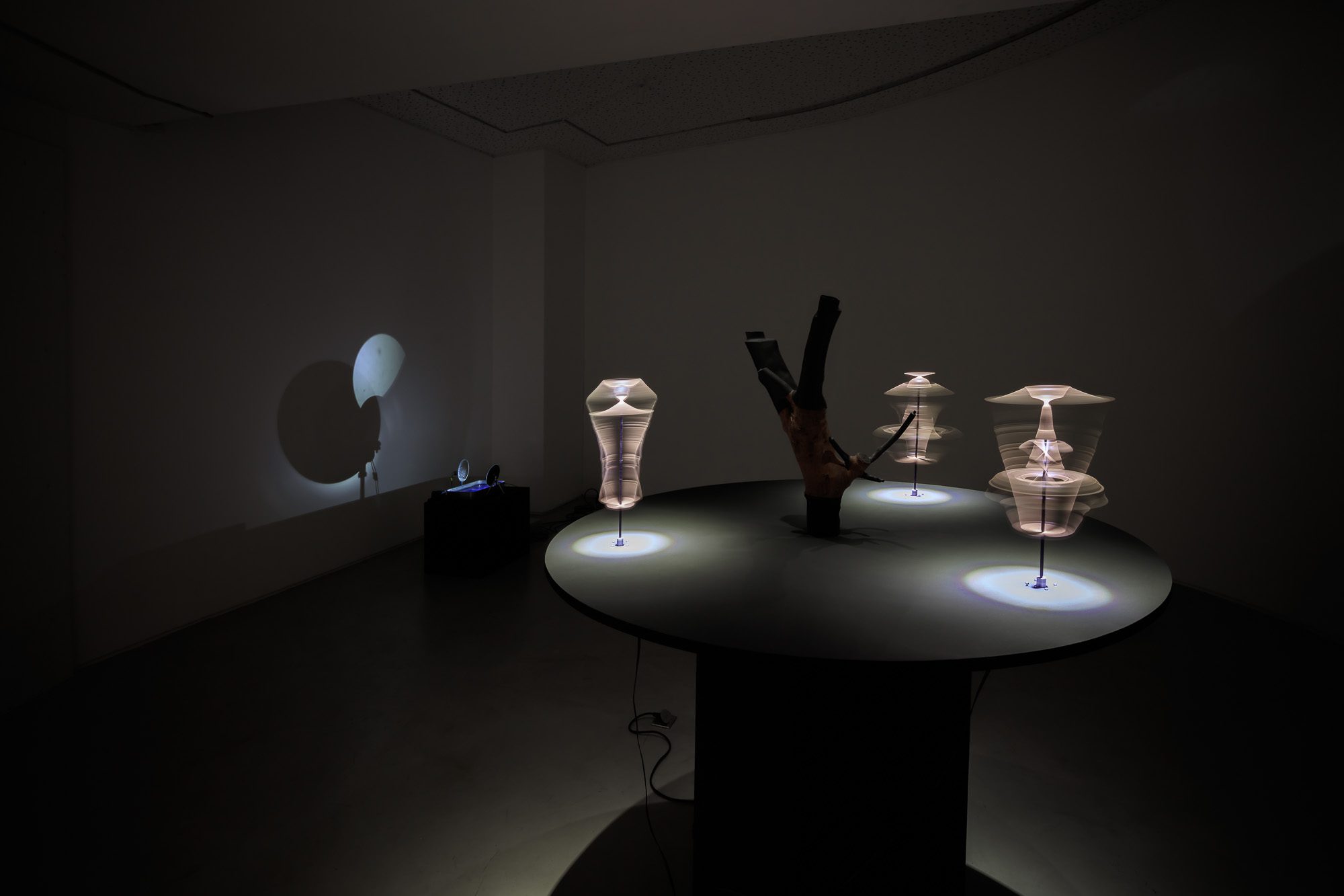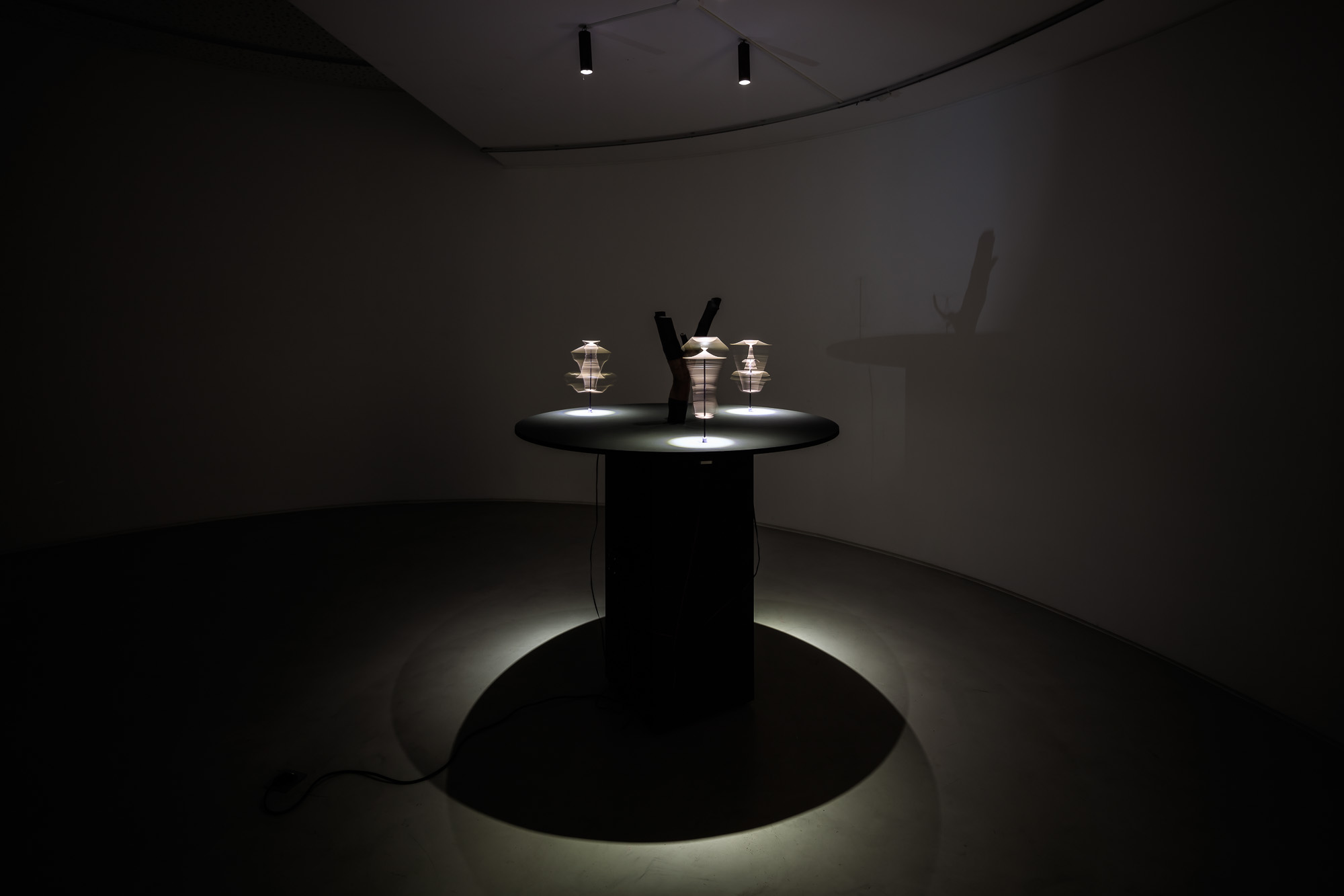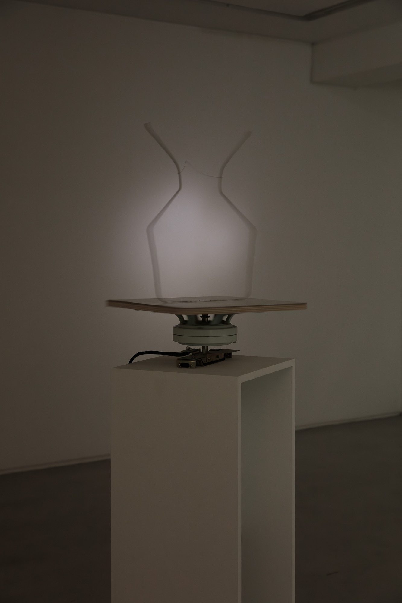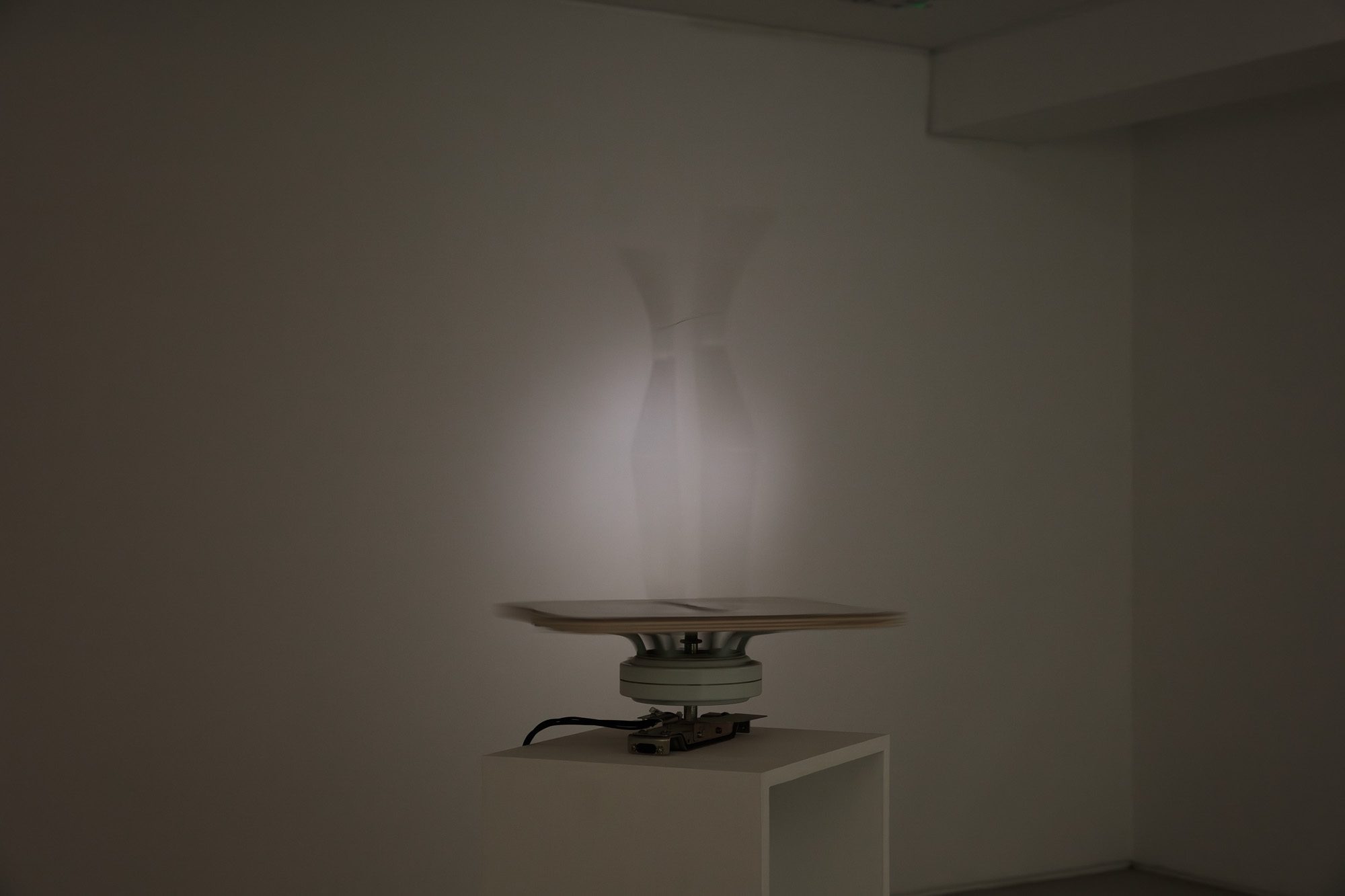 In the dim light, Expansion Tank presents the silhouette of a glass vessel that appears to expand and contract as it rotates around its axis. Its form seems to breathe, modulated by speed and by the reflected light filtering down from the upper floor. This rhythmic motion acts as a prelude to the darkest space of the gallery, where Dancing Affordance directly addresses the mechanisms of perception. Two-dimensional profiles of a tree branch, when rotated at high speed, generate alternative objects, multiple possible interpretations of a single reality, revealing that affordance belongs neither to the object nor to the observer, but to the relationship between the two.
