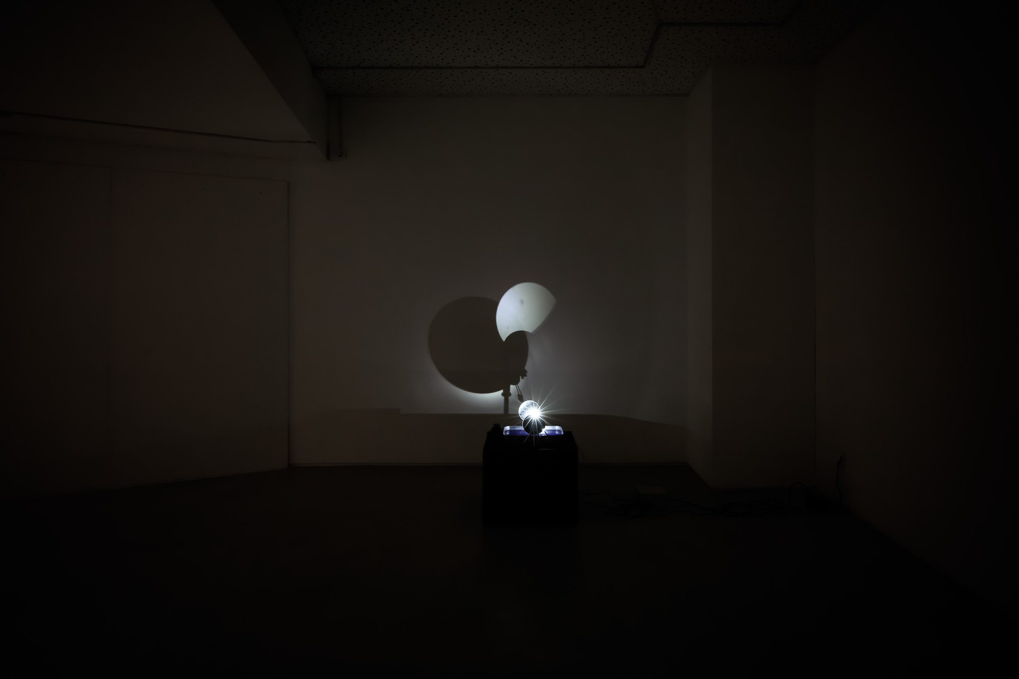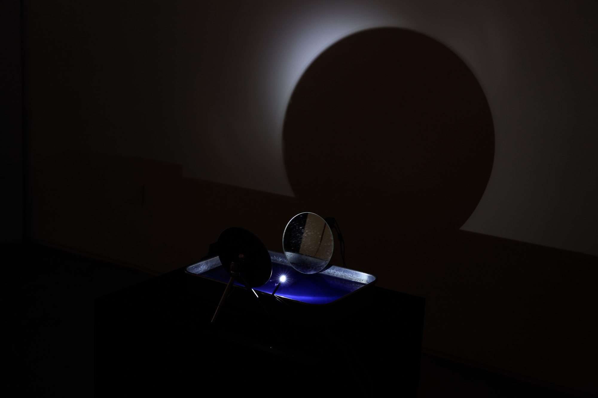 The exhibition concludes with Moon Bubbles and Mirrors Landscape, a minimal and hypnotic installation. A rotating mirror projects an ever-changing eclipse onto the wall, while air bubbles disturb the still surface of a colored pool of water. Through the alternation of these two moments, almost abrupt in their succession, and accompanied by mechanical vibration and bubbling sound, the work condenses the exhibition’s underlying tension: a poetic celebration of the complexity of the world achieved through devices of disarming simplicity.