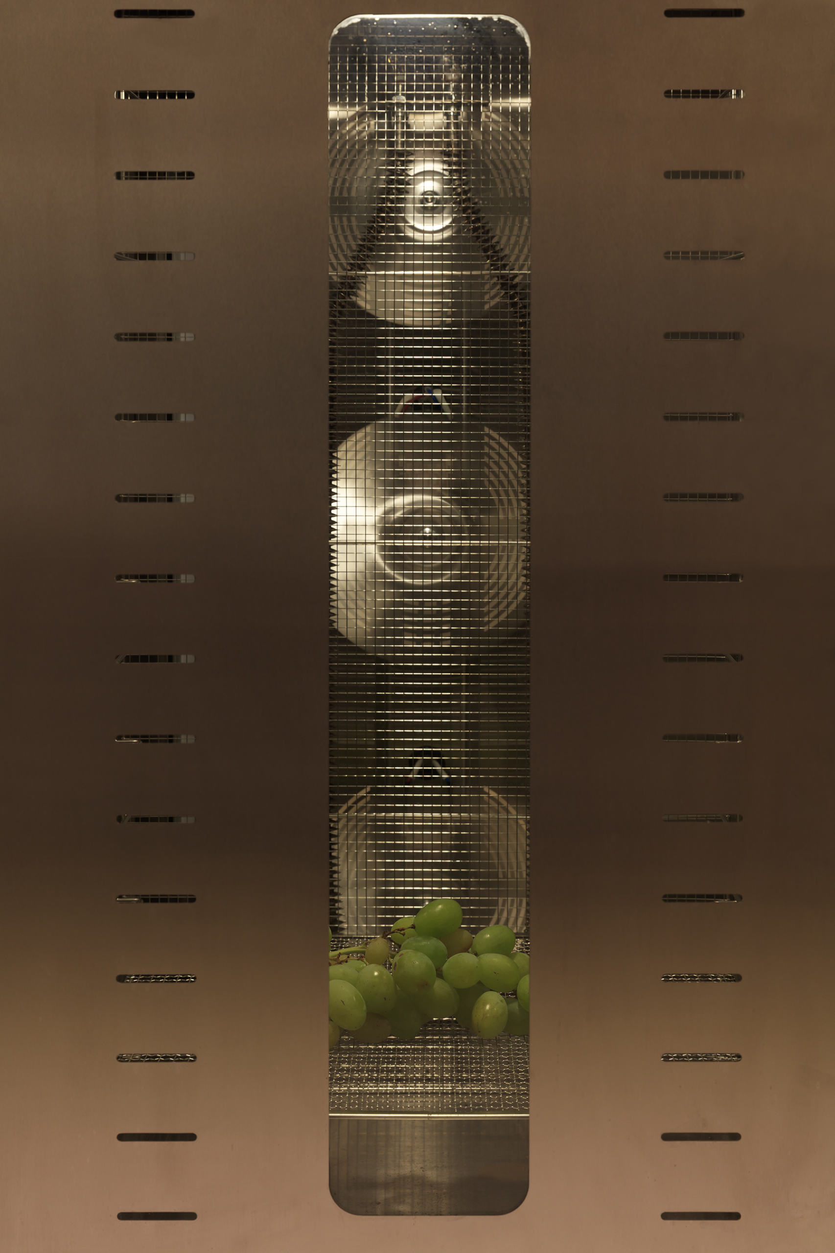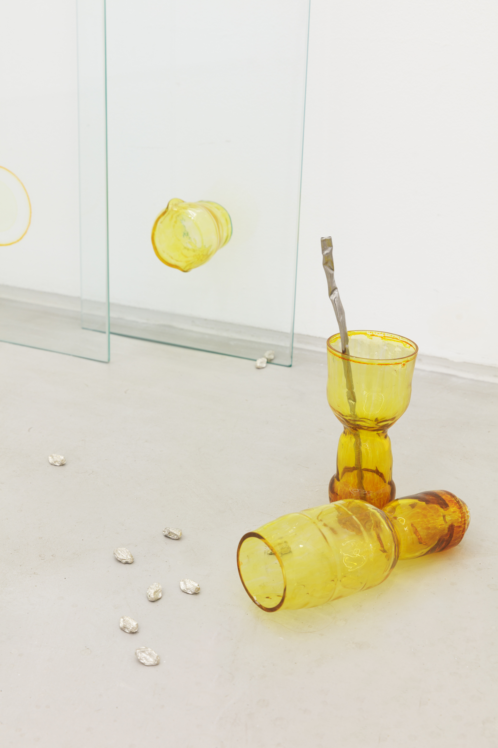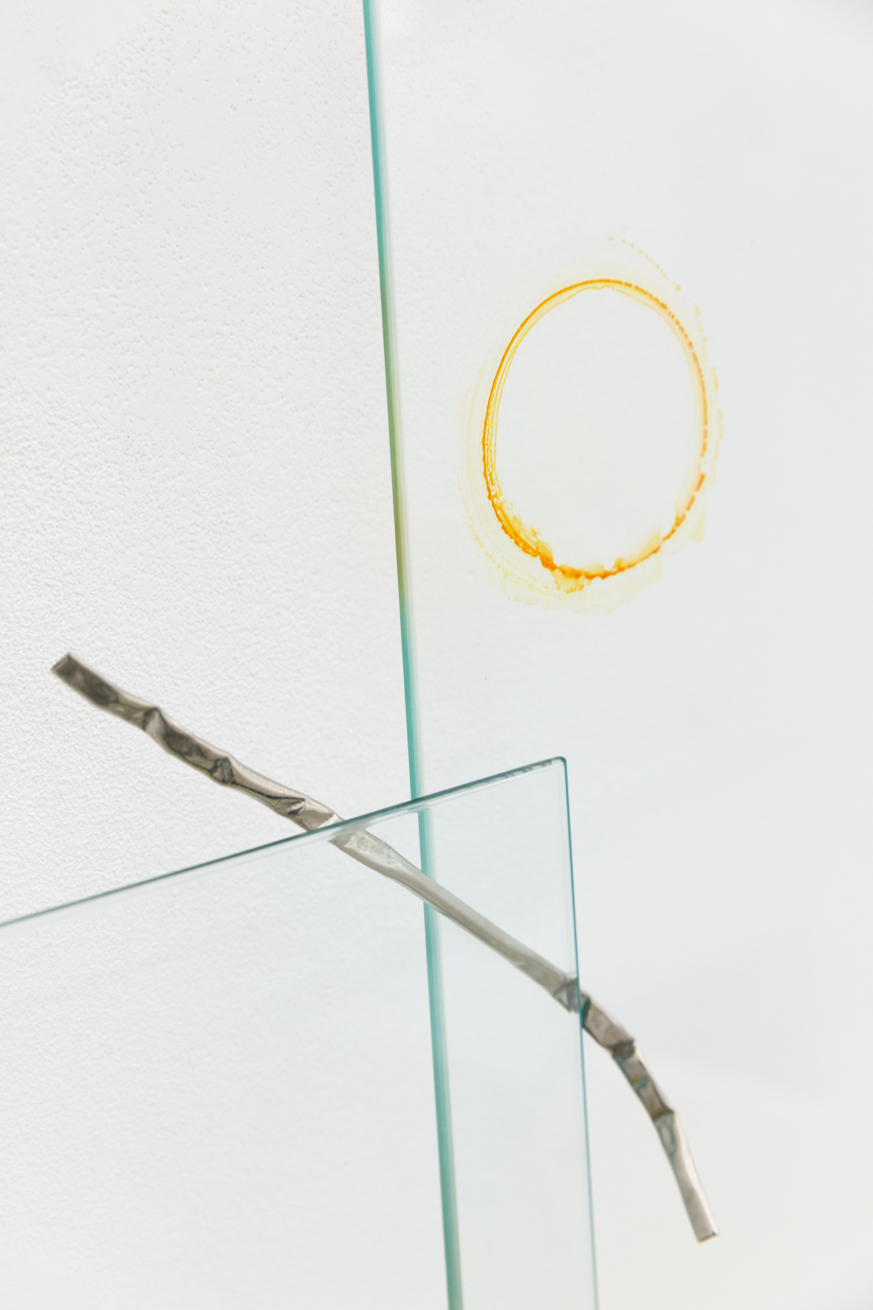 Vidro soprado, Prato de vidro, Canudo de aço, Uva passa prateada, Uva prateada, Tinta alcoólica, Aço inoxidável